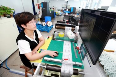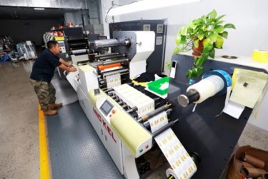 刚踏入生产车间,低沉而有节奏的机械运转声便萦绕耳畔。两条全自动生产线正有条不紊地吞吐着原材料与成品。在生产线起点,一卷卷雪白的标签基材被稳稳固定在放卷装置上,机器启动后,基材像展开的画卷般缓缓进入印刷单元。